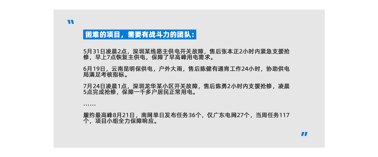 100天眨眼間過去,公司總計完成1419個項目、調(diào)試7270臺裝置,南網(wǎng)“5+2”入網(wǎng)檢測通過率達(dá)100%。收到南網(wǎng)客戶的感謝信7封,口頭表揚數(shù)不勝數(shù)。
