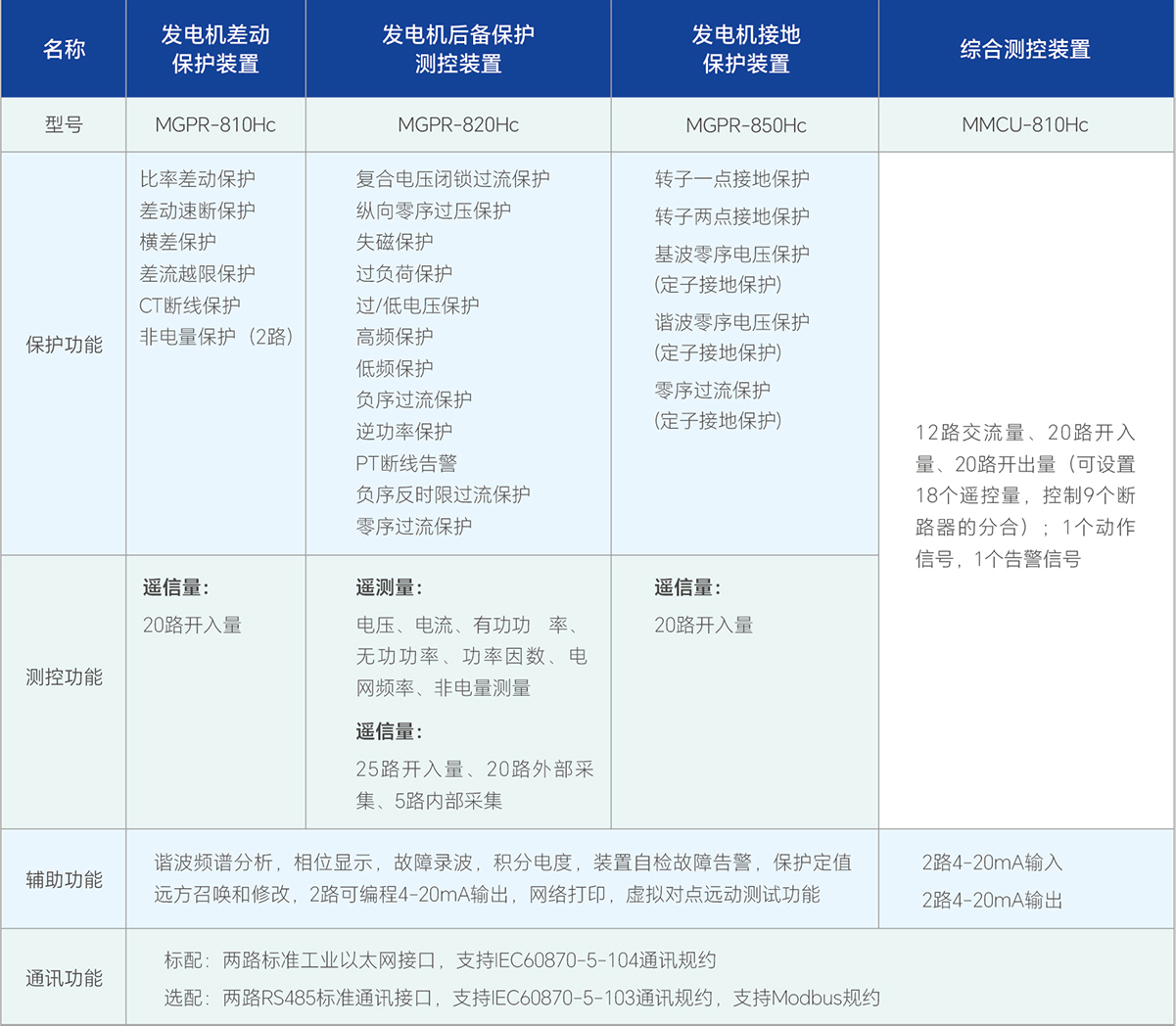 MGPR-800Hc系列發電機成套保護裝置適用于中小容量(100MW 及以下)發電機成套保護,包括發電機差動保護裝置、發電機后備保護測控裝置、發電機接地保護裝置以及選配的綜合測控裝置。本成套保護可單獨組屏,也可以與MTPR-800Hc系列變壓器成套保護結合,組成發電機-變壓器組成套保護。