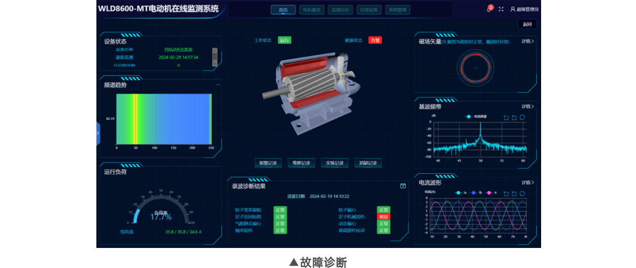 由萬力達電氣自主研發的電機缺陷診斷系統,基于電流特征分析實現電機健康狀態的在線監測及故障預測診斷,融合多業務場景需求構建運維管理功能應用,提供全生命周期綜合管理,提高電機運行效率,降低生產成本,保證企業安全生產。