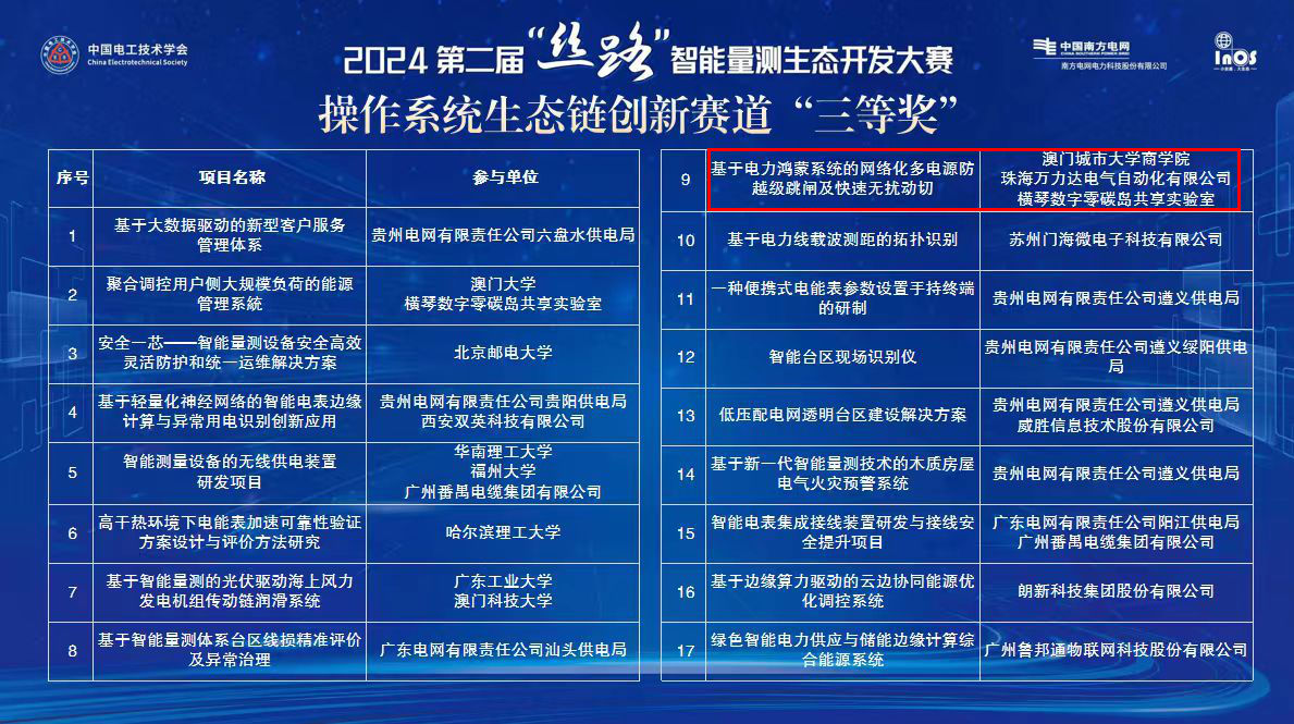 2024年11月23日,珠海萬力達電氣技術股份有限公司與澳門城市大學商學院、橫琴數字零碳島共享實驗室聯手參賽,以“基于電力鴻蒙系統的網絡化多電源防越級跳閘及快速無擾動切換”為主題的創新作品,在中國電工技術學會主辦的2024第二屆中國電氣工程大會暨展覽會及“絲路”智能量測生態開發大賽中,憑借卓越的創新實力和技術優勢,從眾多參賽隊伍中脫穎而出,榮獲“操作系統生態鏈創新賽道”三等獎。這是公司在國家級科技賽事中的重大突破,也是對公司長期堅持技術創新與產學研深度合作的高度肯定。