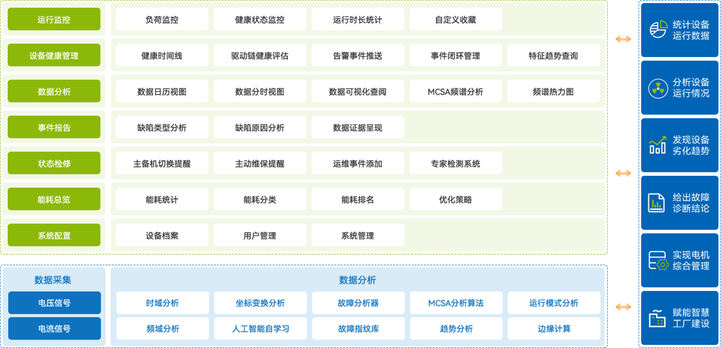 電機缺陷診斷系統通過電流特征分析實現電機故障的監測,并根據故障信息完成故障的定位,系統除了具備電機健康監測、運行分析、波形預覽、趨勢查閱等基礎監測功能外,結合電機基本參數、運檢維修等功能開發更多高級應用,可以實現電機檔案管理、運維消缺、保養維護及報表統計的智能運檢等輔助管理功能,實現電機的綜合管理,賦能智慧工廠的建設。
