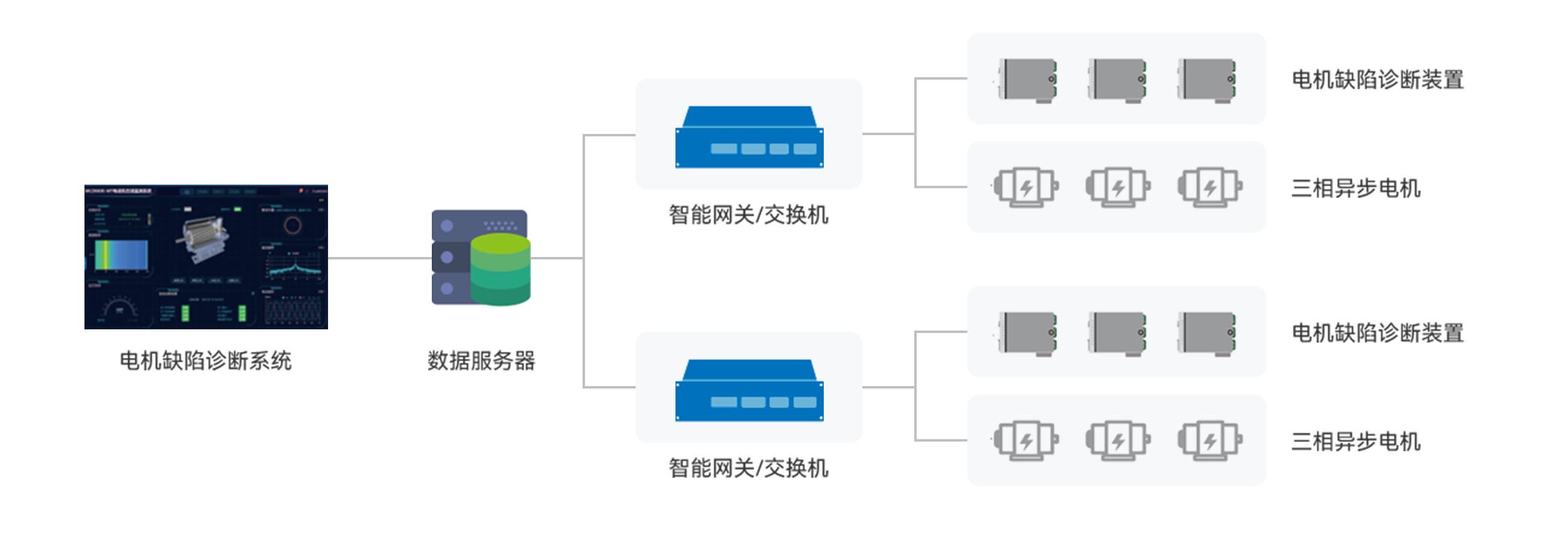 電機缺陷診斷產品由采樣傳感器、電機缺陷診斷裝置所構成的硬件產品及電機缺陷診斷系統組成。其中軟件系統具備電機故障分析、歷史數據查閱及設備管理等功能。由采樣傳感器和電機缺陷診斷裝置構成的硬件系統具備邊緣計算功能,可以將采集的數據預處理后,根據系統設置情況,將數據上送服務器進行深度分析。